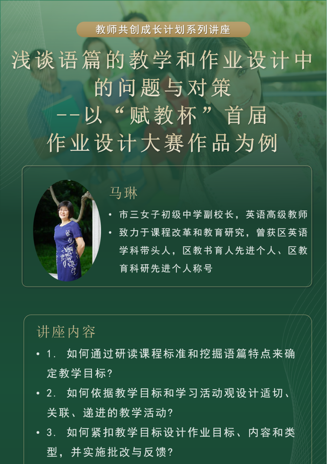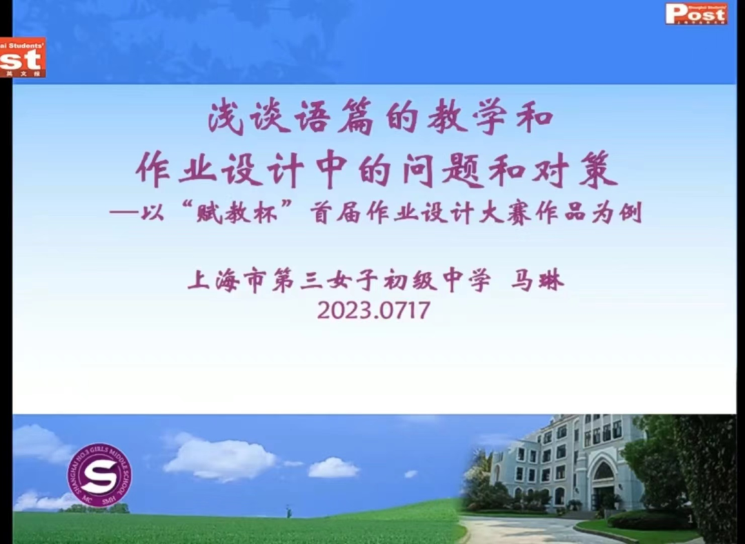本期讲座我们邀请到了上海市英语高级教师马琳老师带来主题为**“浅谈语篇的教学和作业设计中的问题与对策——以“赋教杯”首届作业设计大赛作品为例”**的分享,下拉查看详情。